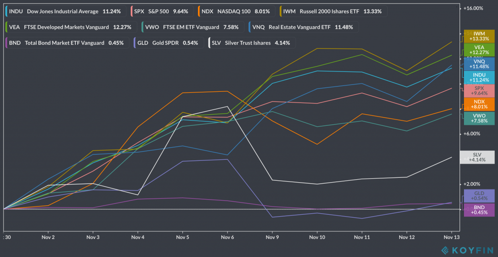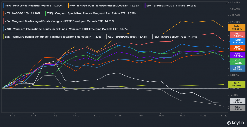 Gold and Silver both dropped a bit but equities had a pretty amazing November. One can’t help but think it was largely driven by vaccine porn. The Russell 2,000 had its best month in history. Other indices shattered records too. Here’s the monthly: