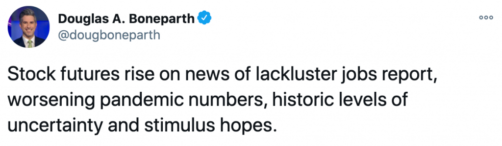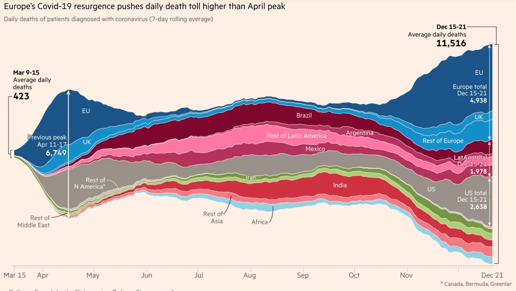 The top half of today’s post is the euphoria in various pockets– those in the top half of the K in this recovery. It seems like the gaps are only going to get wider for the foreseeable future, which is really sad for most people. And although vaccines are here, that doesn’t mean Covid isn’t. Just 19 days into December and it’s already the 2nd worst month of the pandemic. “For the second week in a row, more COVID-19 deaths were reported in the United States than at any other time in the pandemic.” We crossed 300,000 deaths (in the US). Healthcare workers across the country (especially in states like CA) aren’t sitting around reading blogs like this and thinking about the markets. People are struggling. And the struggle will continue for a while. It’s important for us to remain grounded and think about others in less fortunate and safe circumstances.