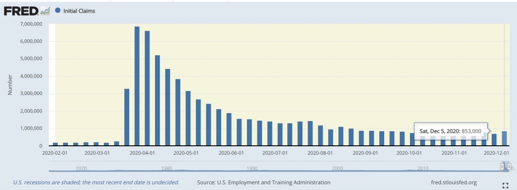 Jobless claims rose to 853k (725k were expected). This is the highest week since mid-September.
