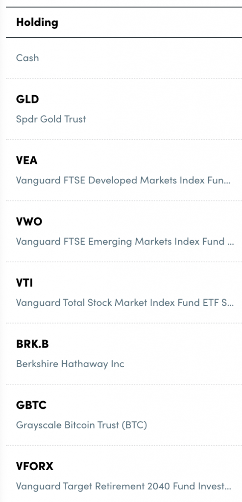 | 1. Cash (27%) | 6. GBTC | 11. VFORX | 16. GOOGL | 21. VTV | 26. PRNT |