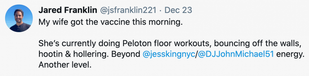 My wife got the Moderna vaccine. For those wondering– no, she didn’t have any negative side effects. By the way, she’s a type 1 diabetic so someone can add this data point to wherever it may be useful. In fact, I think it gave her superpowers. She was amped after!
