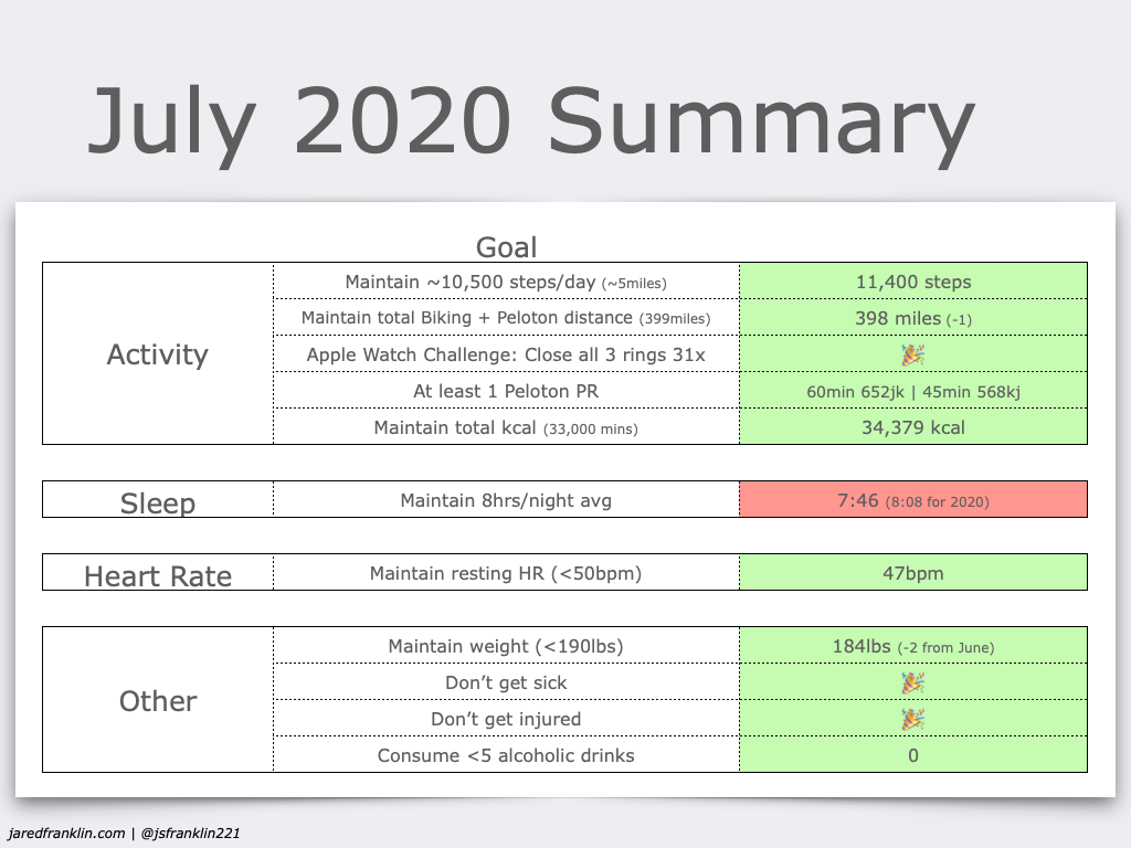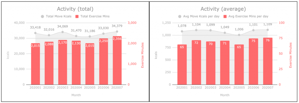 I mainly care about Resting Heart Rate, which was down 1bpm to 47bpm from June. HRV increased from 57ms in May to 59ms in July. I don’t understand it or know if Apple’s measurement is accurate, but I track it anyway. Both went in the opposite direction than we’d like to see.