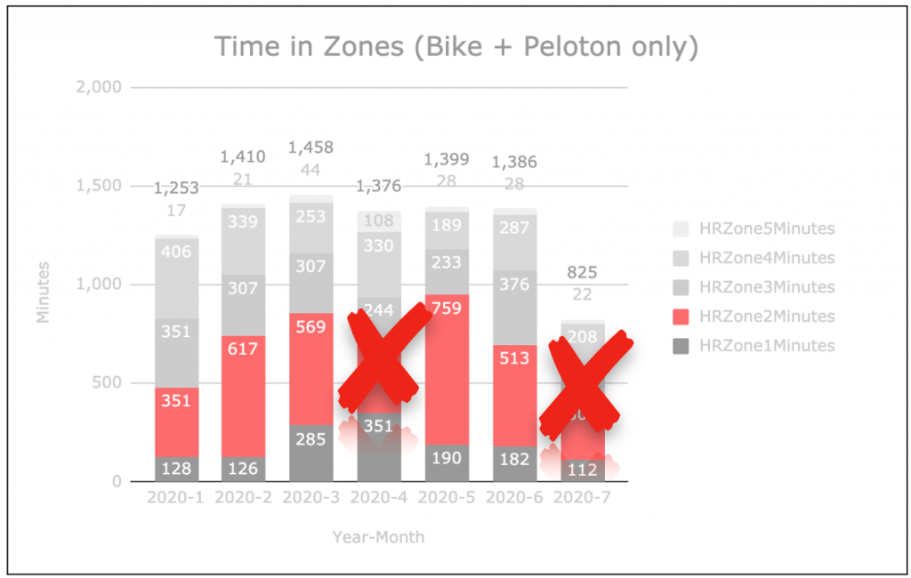 Unfortunately, I have to scrap this section going forward until I look for a better solution. I’ve had too many issues trying to maintain this. I’ve had problems with Training Peaks at times (changing my Zone Ranges on me) and with HealthFit (breaking syncing to Training Peaks). It’s completely wrong in April, and it’s missing half of July.