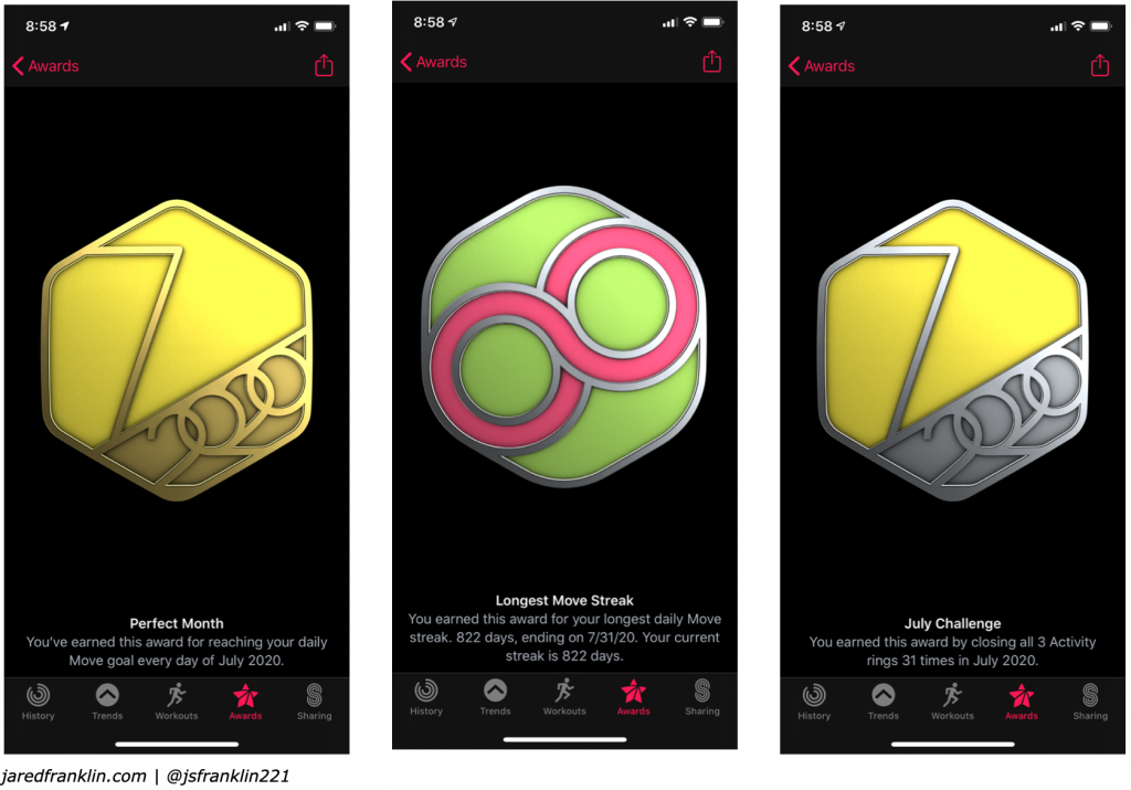 - I continued my long 822+ day move, stand, and exercise streak. I’m really proud of this and am also really impressed with the Apple Watch. 822 days in a row with the same Watch. No problems. Pretty remarkable.