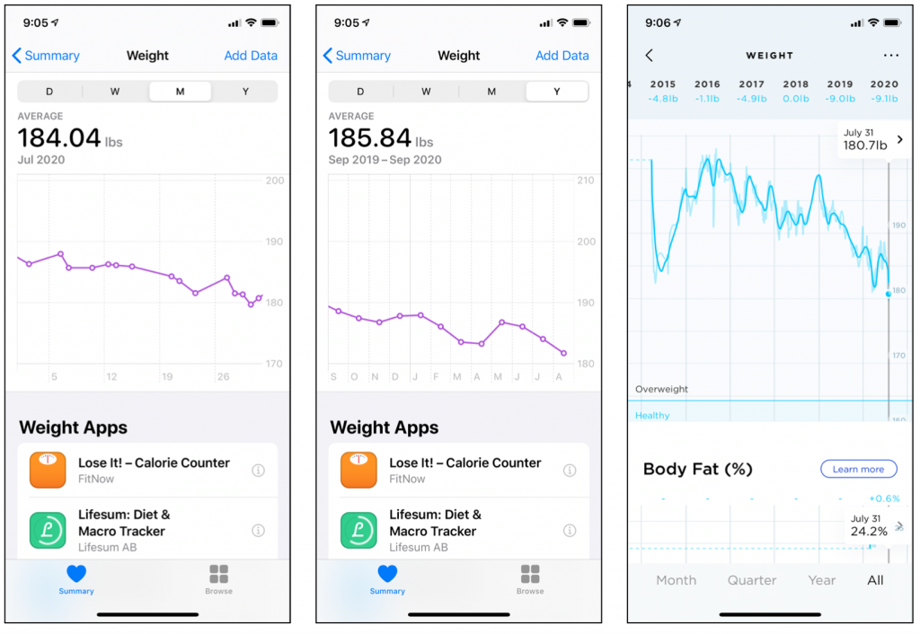 My short term weight management goal is to stay below 190lbs, so I’m right on target at an average of 184 for the month.