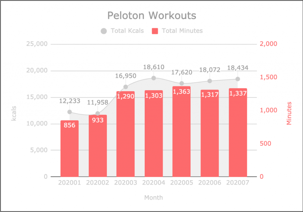 - Kcal from the Peloton increased 362 (July: 18,434 vs. June: 18,072).