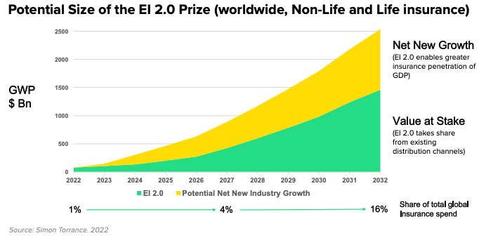 Simon Torrance estimates embedded insurance could grow from 1% today to 16% of the total global insurance distribution (~$1.5t of gross written premium) over the next ten years – $500b in the US alone, $200b in Europe. Even more interesting, it could contribute to growing market's overall size, adding another $1t in net new gross written premium.