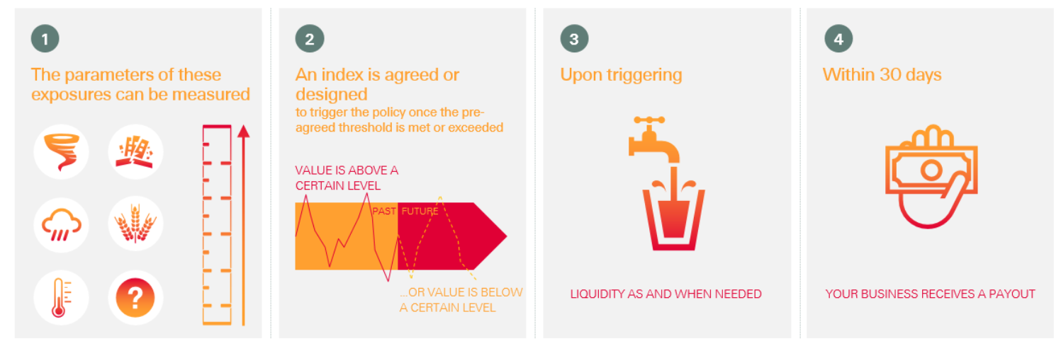 It's a transparent solution where the payable amount is pre-calculated, and payment is sent immediately following a triggering event, regardless of any physical loss is incurred. Weather events (certain magnitude of earthquake or flood, temperature, snowfall, wind speed, etc.) are the most prominent triggers. It can and will continue to be used for many other applications – for example, pandemics, power plant outages, cyber attacks, and regulatory decisions. The parameters or index must be objective and independently verifiable. Popular indexes include the US Geological Survey earthquake magnitude and Singapore National Environmental Agency Pollutant Standard Index.