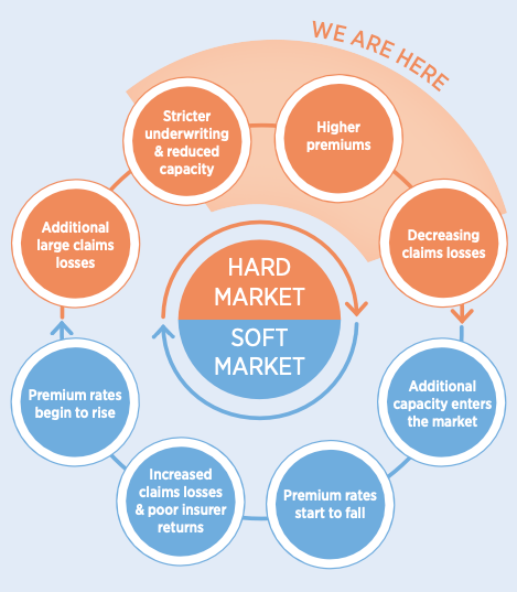 We're currently in the "hard" part of an insurance market cycle. Some insurers failed to keep pace with losses even as they hiked rates prices, and low interest rates made it challenging to offset weak underwriting with investment income. Looking forward, rates for many commercial lines are expected to stabilize, which is good for customers.