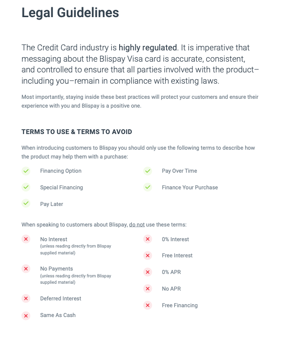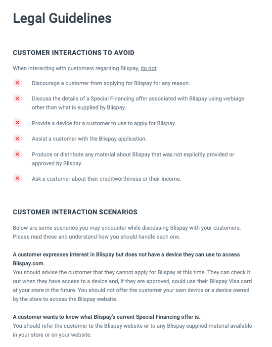 It doesn't matter how detailed you get with documentation. You'll have to hand-hold partners in every department including product people, developers, designers, customer service, finance departments, etc. Below is an example implementation guide we created a while back at Blispay. Guides are never enough to get a partner up and running on their own. They're useful as a reference, and little more.