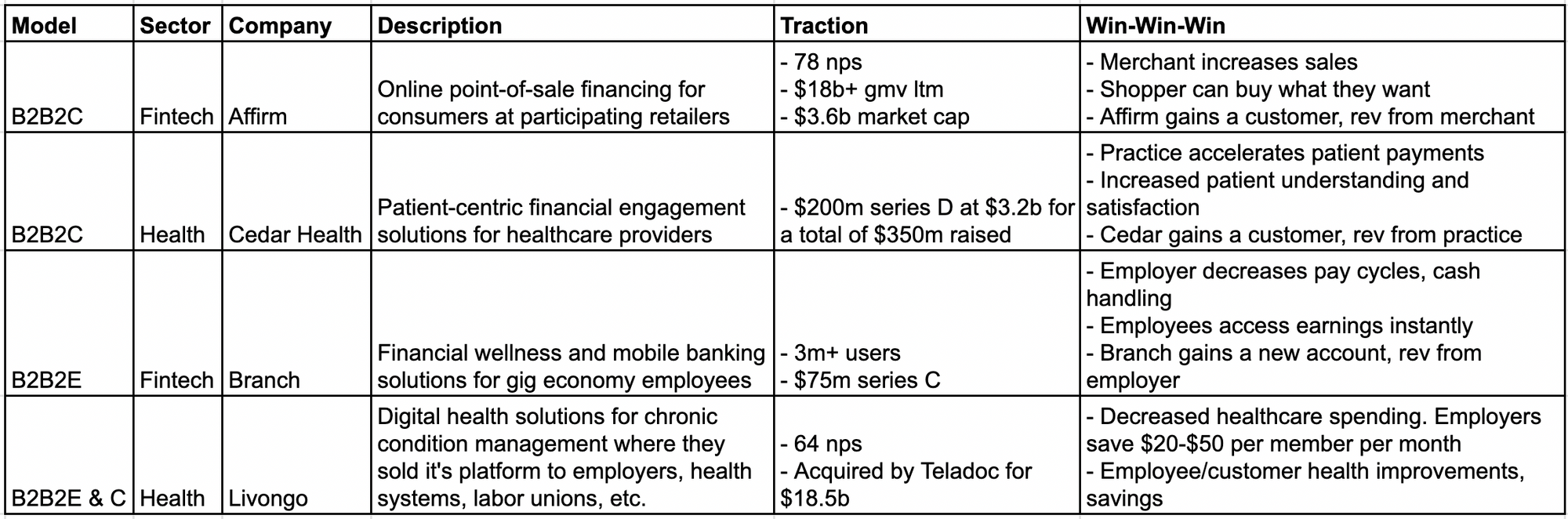 Affirm, Cedar Health, Branch, and Livongo are fun examples to think about across fintech and healthcare.
