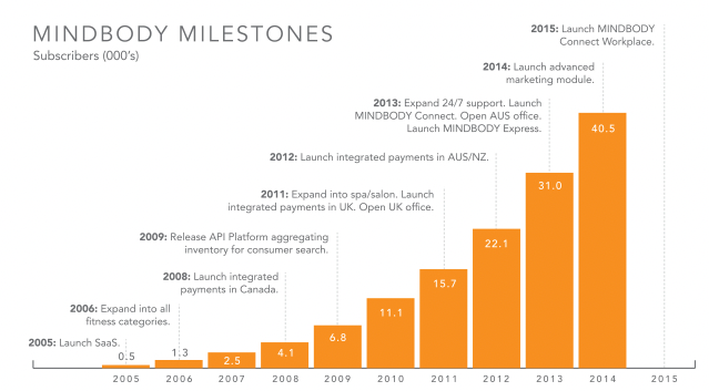 Mindbody started in 2003 with a business management SaaS product for the wellness industry, initially targeting yoga and pilates studios. Mindbody eventually expanded to fitness centers, dance studios, spas, salons, and beyond. They then broadened services to include payment processing, marketing, website development & hosting, and a marketplace for discovering and booking fitness classes. Mindbody is a great example of attacking and dominating a niche.