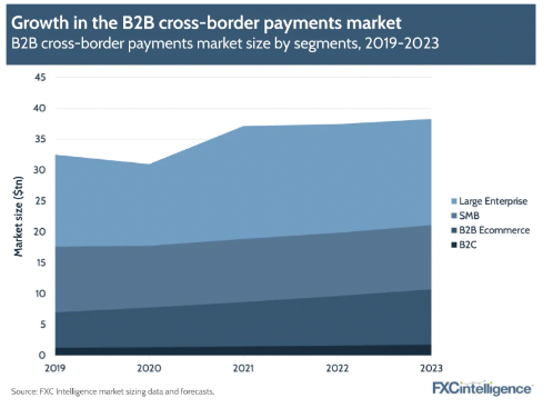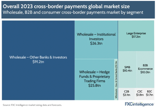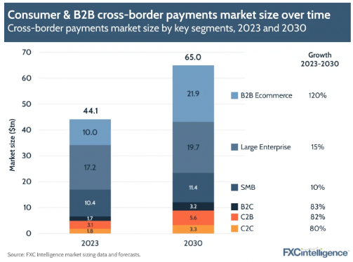 It's big by many different dimensions. Trillions big. FX Intelligence says, "B2B cross-border payments industry is expected to have a market size of $39.3tn for 2023 and grow 43% by 2030 to reach $56.1tn."