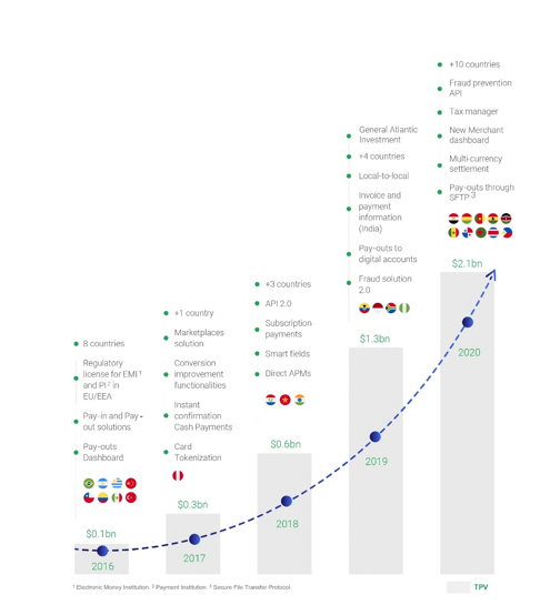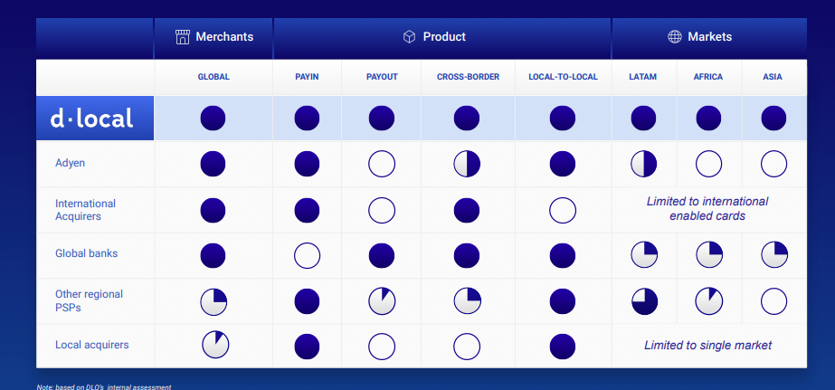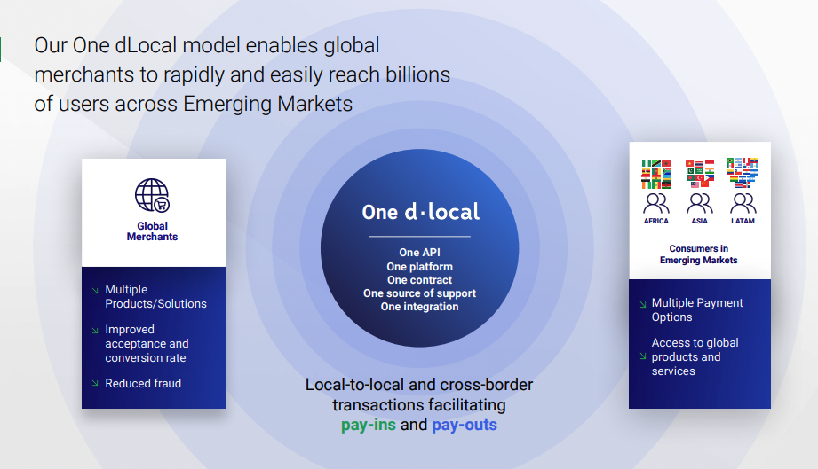 "dLocal is focused on making the complex simple, redefining the online payments experience in emerging markets. Through one direct API, one technology platform, and one contract, which we collectively refer to as the One dLocal model, we enable global enterprise merchants to get paid (pay-in) and to make payments (pay-out) online in a safe and efficient manner. Merchants on our platform consistently benefit from improving acceptance and conversion rates, reduced friction, and improved fraud prevention, leading to enhanced potential interaction with nearly 2 billion combined internet users in the countries we serve (excluding China). Our proprietary, fully cloud-based platform has the ability to power both cross-border and local-to-local transactions in 29 countries as of the date of this prospectus (which includes seven new countries where we have recently made our services available but have not yet processed volume). Our solutions are built to be both payment method-agnostic and user friendly. We enable global merchants to connect with over 600 local payment methods (some of which are financial institutions) across our different geographies, thus expanding their addressable markets."