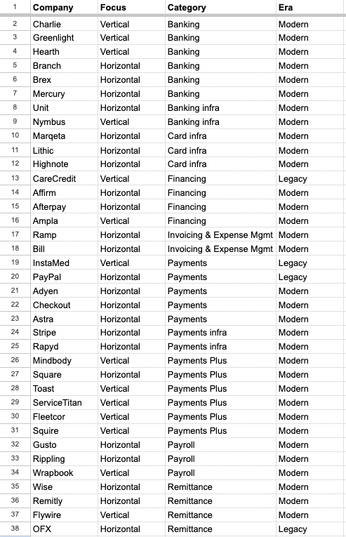 - When it comes to fintech, I think the harder you make a market map makers life, the better (more valuable and durable you'll be). Make it hard to determine if you're vertical or horizontal focused, make it hard to define you just as infra or app, make it hard to stick you in a single category, and even make it hard to categorize you just as a fintech company. Modern companies like Wise, Ramp, and Rippling are good examples.
