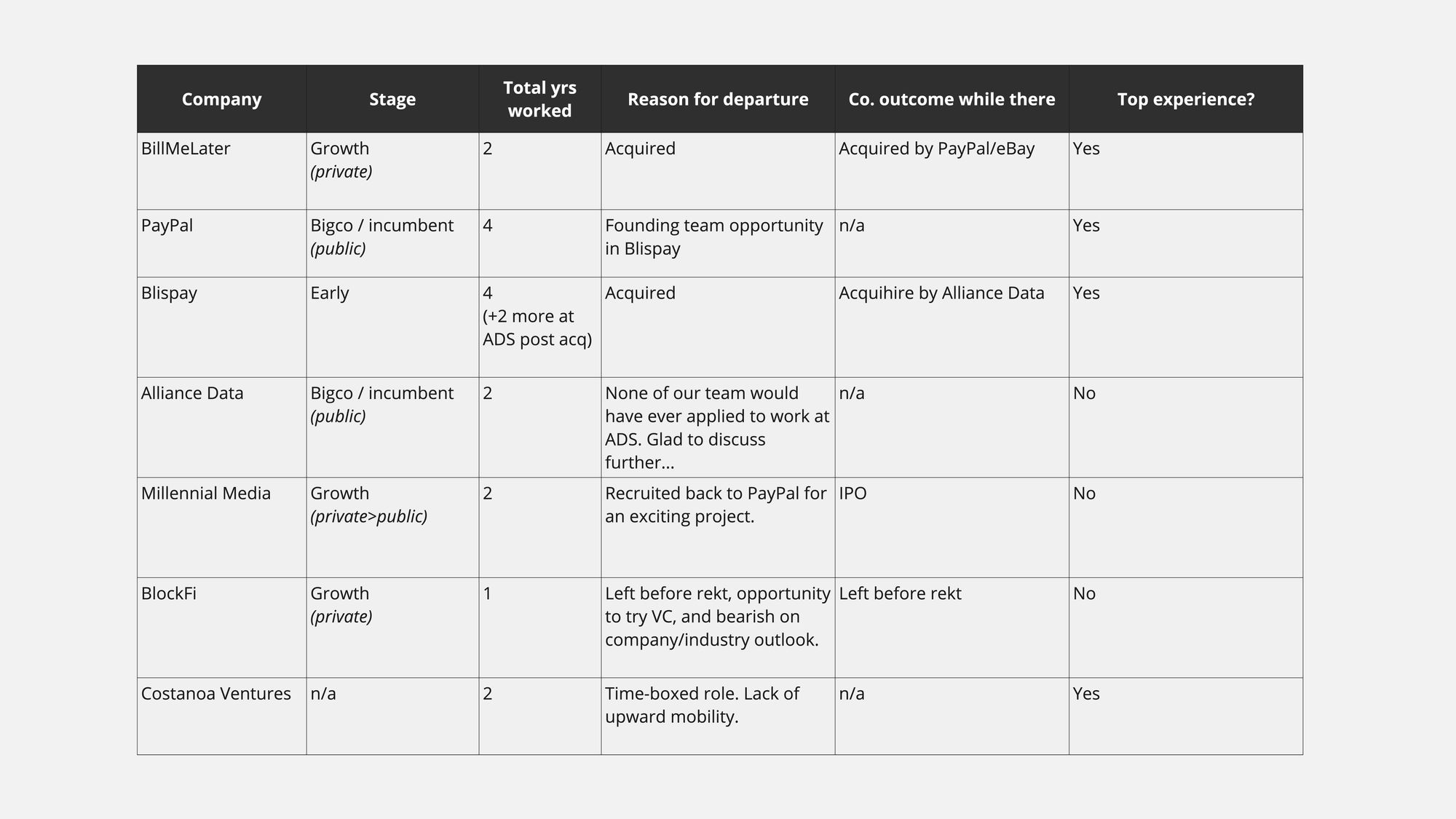 - PayPal: Big, iconic company. I think it's special to work on products that tens of millions of people use. Something I helped lead the build of 10 years ago is still used today, which can't be said by most people in tech.
