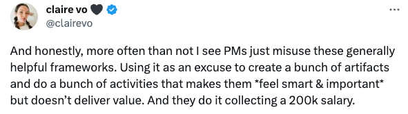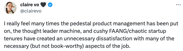The discourse around product management is dynamic. Some people are going as far as saying product managers shouldn't exist. I disagree with that. But I agree it needs to be improved at a lot of companies. I appreciate recent, public commentary from people like Claire Vo, Maia Bittner, and even Matt Janiga.